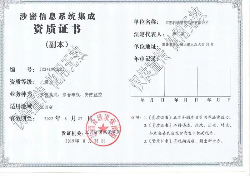 熱烈祝賀江西科瑞智能工程有限公司順利獲得涉密信息系統(tǒng)集成乙級(jí)資質(zhì)證書