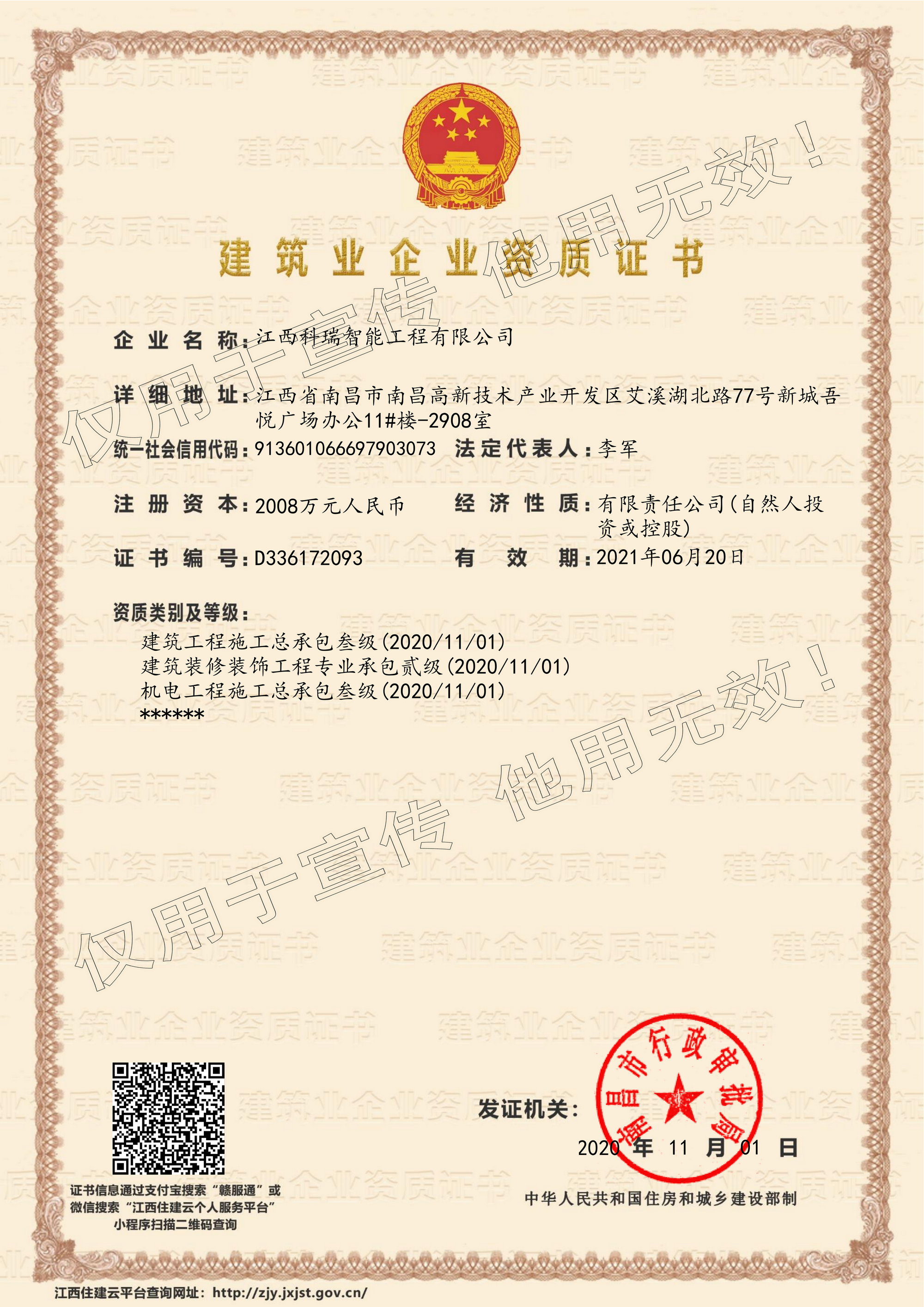 11月1日,經(jīng)南昌市行政審批局審查核準(zhǔn),科瑞智能順利獲得建筑裝修裝飾工程專業(yè)承包貳級、建筑工程施工總承包叁級、機(jī)電工程施工總承包叁級資質(zhì)證書。這是公司繼高新技術(shù)企業(yè)認(rèn)證、涉密信息系統(tǒng)集成乙級、電子與智能化工程專業(yè)承包壹級資質(zhì)升級成功后的又一重大突破。